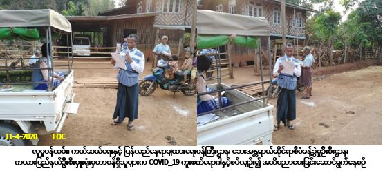 လူမှုဝန်ထမ်း၊ ကယ်ဆယ်ရေးနှင့် ပြန်လည်နေရာချထားရေးဝန်ကြီးဌာန၊ ဘေးအန္တရာယ်ဆိုင်ရာစီမံခန့်ခွဲမှုဉီးစီးဌာန၊ ကယားပြည်နယ်ဦးစီးမှူးရုံးမှတာဝန်ရှိသူများသည် (၁၁-၄-၂၀၂၀) ရက်နေ့တွင် ဒီးမော့ဆိုမြို့နယ်၊ ဝါဘန်းပလို့ကျေးရွာအုပ်စု၊ ဝါဘန်းပလို့ကျေးရွာ၌ COVID-19 ကူးစက်ရောဂါနှင့်စပ်လျဉ်း၍ ဆောင်ရန်/ရှောင်ရန်အချက်များကို အသိပညာပေးနှိုးဆော်ခဲ့ပါကြောင်း သတင်းရရှိပါသည်။