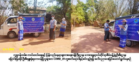လူမှုဝန်ထမ်း၊ ကယ်ဆယ်ရေးနှင့် ပြန်လည်နေရာချထားရေးဝန်ကြီးဌာန၊ ဘေးအန္တရာယ်ဆိုင်ရာစီမံခန့်ခွဲမှုဉီးစီးဌာန၊ မြောင်းမြခရိုင်ဦးစီးမှူးရုံးမှတာဝန်ရှိသူများသည် (၁၁-၄-၂၀၂၀) ရက်နေ့၊ (၁၄:၀၀) နာရီအချိန်တွင် မြောင်းမြခရိုင်၊ အိမ်မဲမြို့နယ်၊ ရွာသစ်ကျေးရွာအုပ်စု၊ ရွာသစ်ကျေးရွာ၊ ဝဲကြီးဝကျေးရွာအုပ်စု၊ ဝဲကြီးဝကျေးရွာ၊ ရှမ်းကွင်းကျေးရွာအုပ်စု၊ ညောင်ကျိုးကျေးရွာ၊ အရှေ့ရှမ်းကွင်းကျေးရွာ၊ အနောက်ရှမ်းကွင်းကျေးရွာများ၌ COVID-19 ကူးစက်ရောဂါနှင့်စပ်လျဉ်း၍ ဆောင်ရန်/ရှောင်ရန် အချက်များကို အသိပညာပေးနှိုးဆော်ခဲ့ပါကြောင်း သတင်းရရှိပါသည်။