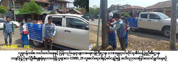 လူမှုဝန်ထမ်း၊ ကယ်ဆယ်ရေးနှင့် ပြန်လည်နေရာချထားရေးဝန်ကြီးဌာန၊ ဘေးအန္တရာယ်ဆိုင်ရာစီမံခန့်ခွဲမှုဉီးစီးဌာန၊ ကချင်ပြည်နယ်ဦးစီးမှူးရုံးမှတာဝန်ရှိသူများသည် (၁၁-၄-၂၀၂၀) ရက်နေ့တွင် မြစ်ကြီးနားမြို့နယ်၊ ရွှေညောင်ပင်ရပ်ကွက်၊ အေးစေတီရပ်ကွက်၊ ကျွန်းပင်သာရပ်ကွက်တို့၌ COVID-19 ကူးစက်ရောဂါနှင့်စပ်လျဉ်း၍ ဆောင်ရန်/ရှောင်ရန် အချက်များကို အသံချဲ့စက်ဖြင့် လှည့်လည်အသိပညာပေးနှိုးဆော်ခဲ့ပြီး လက်ကမ်းစာစောင်များဖြန့်ဝေခဲ့ပါကြောင်း သတင်းရရှိပါသည်။