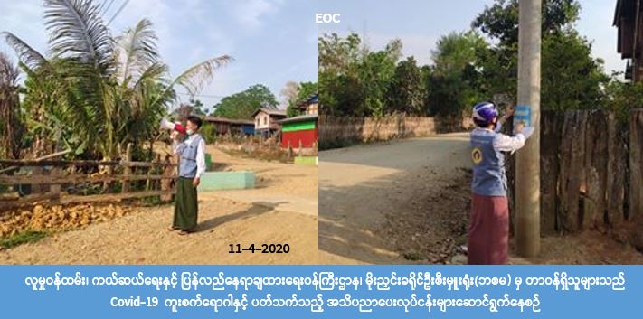 လူမှုဝန်ထမ်း၊ ကယ်ဆယ်ရေးနှင့် ပြန်လည်နေရာချထားရေးဝန်ကြီးဌာန၊ ဘေးအန္တရာယ်ဆိုင်ရာ စီမံခန့်ခွဲ မှုဦးစီးဌာန၊ မိုးညှင်းခရိုင်ဦးစီးမှူးရုံးမှတာဝန်ရှိသူများသည် (၁၁-၄-၂၀၂၀) ရက်နေ့ (၁၆:၀၀) အချိန်၌ မိုးညှင်းမြို့နယ်၊ သာယာကုန်းကျေးရွာတွင် COVID-19 ကူးစက်ရောဂါနှင့်ပတ်သက်၍ ဆောင်ရန်၊ ရှောင် ရန်အချက်များ၊ လိုက်နာရမည့်အချက်များအား သိရှိစေရန်အတွက်အသိပညာပေးနှိုးဆော်ခြင်းများ ဆောင်ရွက်ခဲ့ကြောင်း သိရှိရပါသည်။