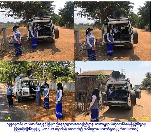 လူမှုဝန်ထမ်း၊ ကယ်ဆယ်ရေးနှင့် ပြန်လည်နေရာချထားရေးဝန်ကြီးဌာန၊ ဘေးအန္တရာယ်ဆိုင်ရာစီမံခန့်ခွဲမှုဦးစီးဌာန၊ ပြည် ခရိုင်ဦးစီးမှူးရုံးမှ တာဝန်ရှိသူများသည် (၁၁-၄-၂၀၂၀) ရက်နေ့တွင် ပြည်ခရိုင်၊ ရွှေတောင်မြို့နယ်၊ နွားမယံကျေးရွာ၊ လေးကျွန်း ဆီမီးကျေးရွာနှင့် ပုတ္တန်းကျေးရွာများတွင် (COVID – 19) ရောဂါကူးစက်ပျံ့နှံ့မှုများနှင့်ပတ်သက်၍ ပြည်သူများထံသို့ အသိ ပညာပေးနှိုးဆော်မှုများ ဆောင်ရွက်ခဲ့ပါကြောင်း သတင်းရရှိပါသည်။