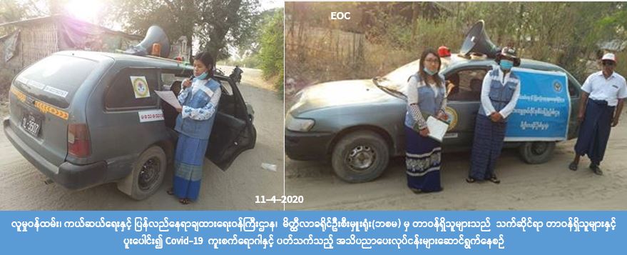 လူမှုဝန်ထမ်း၊ ကယ်ဆယ်ရေးနှင့် ပြန်လည်နေရာချထားရေးဝန်ကြီးဌာန၊ ဘေးအန္တရာယ်ဆိုင်ရာ စီမံခန့်ခွဲမှု ဦးစီးဌာန၊ မိတ္ထီလာခရိုင်ဦးစီးမှူးရုံးမှတာဝန်ရှိသူများသည် (၁၁-၄-၂၀၂၀)နေ့တွင် မိတ္ထီလာမြို့နယ်၊ လျော်ဖြူကန်အုပ်စု၊ ကဖြူအုပ်စုနှင် ရှမ်းတဲအုပ်စုတို့၏ ကျေးရွာခွဲများရှိပြည်သူများအား COVid-19နှင့် ပတ်သက်၍ ဆောင်ရန်၊ရှောင်ရန်အချက်များ၊ ဥပဒေများ၊ ပြည်သူများလိုက်နာဆောင်ရွက်ရန် အချက် များကို ကျေးရွာအုပ်ချုပ်ရေးမှူးများ၊ တာဝန်ခံများ၊ ရှမ်းတဲမေတ္တာလူမှုကူညီရေးအသင်းနှင့်အတူ လိုက်လံ အသိပညာပေးဆော်ဩခဲ့ကြောင်း သိရှိရပါသည်။