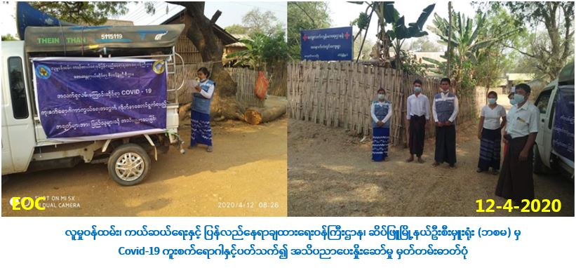 လူမှုဝန်ထမ်း၊ ကယ်ဆယ်ရေးနှင့် ပြန်လည်နေရာချထားရေးဝန်ကြီးဌာန၊ ဘေးအန္တရာယ်ဆိုင်ရာစီမံ ခန့်ခွဲမှုဦးစီးဌာန၊ မကွေးတိုင်းဒေသကြီး၊ ပခုက္ကူခရိုင်၊ ဆိပ်ဖြူမြို့နယ်ဦးစီးမှူးရုံးမှ တာဝန်ရှိသူများသည် (၁၂-၄-၂၀၂၀) ရက်နေ့၊ နံနက် (၀၈:၀၀) အချိန်မှ (၁၃:၀၀) အချိန်အထိ ကျန်းမာရေးဌာနမှ တာဝန်ရှိသူများ၊ ကျေးရွာအုပ်ချုပ်ရေးမှူးများ၊ ရပ်ကျေးစာရေးနှင့်အတူ ပူးပေါင်း၍ ရေပုတ် ကျေးရွာ အုပ်စုရှိ ရေပုတ်ကျေးရွာနှင့် ဇီးဖြူကောင်းကျေးရွာ၊ အနောက်ကံတွင်းကျေးရွာအုပ်စုရှိ အနောက်ကံတွင်း ကျေးရွာနှင့် သဖန်းတုံးကျေးရွာတို့တွင် လှည့်လည်၍ Covid-19 ရောဂါနှင့်ပတ်သက်၍ ဆောင်ရန်/ ရှောင်ရန် အချက်များအား အသိပညာပေးခြင်းများ ဆောင်ရွက်ခဲ့ပါကြောင်း သတင်းရရှိပါသည်။