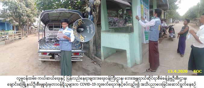လူမှုဝန်ထမ်း၊ ကယ်ဆယ်ရေးနှင့် ပြန်လည်နေရာချထားရေးဝန်ကြီးဌာန၊ ဘေးအန္တရာယ်ဆိုင်ရာစီမံခန့်ခွဲမှုဦးစီး ဌာန၊ ချောင်းဆုံမြို့နယ်ဦးစီးမှူးရုံးမှတာဝန်ရှိသူများသည် (၁၃-၄-၂၀၂၀) ရက်နေ့၊ (၀၈:၃၀) နာရီအချိန်မှ (၁၀:၃၀) နာရီအချန်အထိ မွန်ပြည်နယ်၊ မော်လမြိုင်ခရိုင်၊ ချောင်းဆုံမြို့နယ်၊ ခရိုက်ဒူးကျေးရွာနှင့် ခရိုက်နှီးဟုကျေးရွာအတွင်းရှိ လမ်းဆုံလမ်းခွများနှင့် လူစည်ကားရာနေရာများ၌ COVID-19 ကူးစက်ရောဂါနှင့်စပ်လျဉ်း၍ ကြိုတင်ကာကွယ်ထိန်းချုပ်နိုင်ရန် ပြည်သူသို့ အသိပညာပေး ပန်ကြားချက်များအား အသံချဲ့စက်များဖြင့် အသိပညာပေးနှိုးဆော်ခဲ့ပါကြောင်း သတင်းရရှိပါသည်။