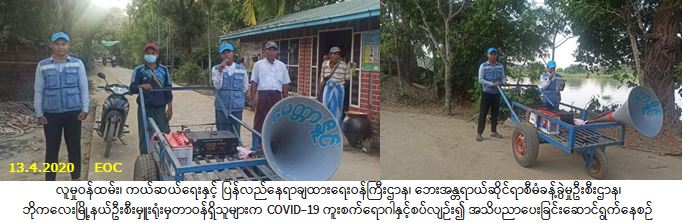 လူမှုဝန်ထမ်း၊ ကယ်ဆယ်ရေးနှင့် ပြန်လည်နေရာချထားရေးဝန်ကြီးဌာန၊ ဘေးအန္တရာယ်ဆိုင်ရာစီမံခန့်ခွဲမှုဦးစီး ဌာန၊ ဘိုကလေးမြို့နယ်ဦးစီးမှူးရုံးမှတာဝန်ရှိသူများသည် (၁၃-၄-၂၀၂၀) ရက်နေ့၊ (၁၀:၀၀) နာရီအချိန်တွင် ဘိုကလေးမြို့နယ်၊ စိန်ဟိုင်းကျေးရွာအုပ်စု၊ စိန်ဟိုင်းကျေးရွာ၌လည်းကောင်း၊ (၁၂:၀၀) နာရီအချိန်တွင် သူဌေးကုန်းကျေးရွာ၌လည်းကောင်း၊ (၁၄:၀၀) နာရီအချိန်တွင် ဝဲဒေါင့်ကျေးရွာ၌လည်းကောင်း၊ COVID-19 ကူးစက်ရောဂါနှင့်စပ်လျဉ်း၍ ဆောင်ရန်/ရှောင်ရန်အချက်များကို ကျေးရွာအုပ်ချုပ်ရေးမှူး၊ ရပ်မိ/ရပ်ဖများနှင့် အတူ အသိပညာပေးနှိုးဆော်ခဲ့ပါကြောင်း သတင်းရရှိပါသည်။