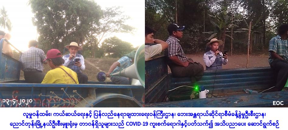 လူမှုဝန်ထမ်း၊ ကယ်ဆယ်ရေးနှင့် ပြန်လည်နေရာချထားရေးဝန်ကြီးဌာန၊ ဘေးအန္တရာယ်ဆိုင်ရာစီမံ ခန့်ခွဲမှုဦးစီးဌာန၊ ညောင်တုန်းမြို့နယ်ဦးစီးမှူးရုံးမှ တာဝန်ရှိသူများသည် (၁၃-၄-၂၀၂၀) ရက်နေ့တွင် ညောင်တုန်းမြို့နယ်၊ ပါလှဲ့အထက်ကျေးရွာအုပ်စုအတွင်းရှိ ကျေးရွာ (၁၀) ရွာ၌ COVID-19 ရောဂါ ကာကွယ်၊ တာဆီး၊ ထိန်းချုပ်၊ ကုသရေးဆိုင်ရာများကို အသိပညာပေးခြင်းများ လှည့်လည် ဆောင်ရွက်ခဲ့ကြောင်း သတင်းရရှိပါသည်။