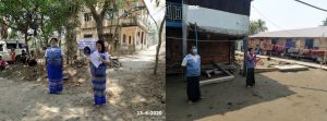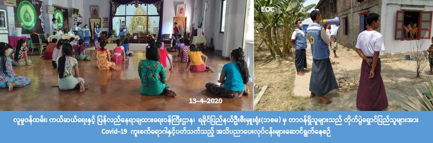 လူမှုဝန်ထမ်း၊ ကယ်ဆယ်ရေးနှင့်ပြန်လည်နေရာချထားရေးဝန်ကြီးဌာန၊ ဘေးအန္တရာယ်ဆိုင်ရာစီမံခန့်ခွဲမှုဦးစီးဌာန၊ ရခိုင်ပြည်နယ်ဦးစီးမှူးရုံးမှ တာဝန်ရှိသူများသည် (၁၃-၄-၂၀၂၀)ရက်တွင် (၀၉:၀၀) နာရီမှ(၁၅:၀၀) ထိ စစ်တွေမြို့ ပေါ်ရှိ တိုက်ပွဲရှောင်စုရပ်များဖြစ်သော ကရုချောင်းဘုန်းတော်ကြီးကျောင်း၊ ဇမ္ဗူရတနာကျောင်းတိုက်၊ မဟာမုဗုဒ္ဓ ဝိဟာရဘုန်းတော်ကြီးကျောင်း၊ နန်းရွှေဂူဘုန်းတော်ကြီးကျောင်း၊ ဓမ္မရာမဘုန်းတော်ကြီးကျောင်း၊ မဟာဝိဇယာ ရာမကျောင်းတိုက်၊ အလိုတော်ပြည့်ကျောင်းတိုက်များသို့ သွားရောက်၍ တိုက်ပွဲရှောင်ပြည်သူများအတွက် Covid-19 ကူးစက်ရောဂါနှင့်ပတ်သက်၍ ဆောင်ရန်၊ ရှောင်ရန်များ အသိပညာပေး ဆော်သြခဲ့ကြောင်း သိရှိရပါသည်။