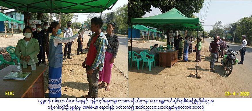လူမှုဝန်ထမ်း၊ ကယ်ဆယ်ရေးနှင့်ပြန်လည်နေရာချထားရေးဝန်ကြီးဌာန၊ ဘေးအန္တရာယ်ဆိုင်ရာစီမံခန့်ခွဲမှုဦးစီးဌာန၊ ဂန့်ဂေါခရိုင် ဦးစီးမှူးရုံးမှ တာဝန်ရှိသူများသည် မြို့နယ်အထွေထွေအုပ်ချုပ်ရေးဦးစီးဌာန၊ ဌာနဆိုင်ရာများမှ တာဝန်ရှိသူများဖြင့်ပူးပေါင်း၍ (၁၃–၄–၂၀၂၀) ရက်နေ့ (ဝ၈:၃၀) နာရီမှ (၁၇:၃၀) နာရီအချိန်ထိ လတ်တလောနိုင်ငံအသီးသီးတွင် ကူးစက်ပြန့်ပွါးလျက်ရှိသည့် COVID-19 ရောဂါကြိုတင်ကာကွယ်ရေးအတွက် ဂန့်ဂေါခရိုင်အတွင်းယာဉ် ဝင်/ထွက် အတွက် စီးနင်းလိုက်ပါလာသော ခရီးသည်များအား ကိုယ်အပူချိန်တိုင်းထွာပေးခြင်းနှင့် ပြည်တွင်း/ပမှ ပြန်လာသူများအား စာရင်းပြုစုခြင်းတို့ကို ဆောင်ရွက် ခဲ့ကြောင်း သတင်းရရှိပါသည်။
