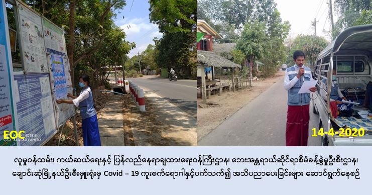 လူမှုဝန်ထမ်း၊ ကယ်ဆယ်ရေးနှင့် ပြန်လည်နေရာချထားရေးဝန်ကြီးဌာန၊ ဘေးအန္တရာယ်ဆိုင်ရာ စီမံခန့်ခွဲမှုဦးစီးဌာန၊ ချောင်းဆုံမြို့နယ်ဦးစီးမှူးရုံးမှ တာဝန်ရှိသူများသည် (၁၄-၄-၂၀၂၀) ရက်နေ့ ၊ (၀၉:၃၀) နာရီအချိန်မှ (၁၁:၃၀) နာရီအချိန်ထိ မွန်ပြည်နယ်၊ မော်လမြိုင်ခရိုင်၊ ချောင်းဆုံမြို့နယ်၊