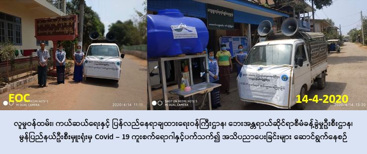 လူမှုဝန်ထမ်း၊ ကယ်ဆယ်ရေးနှင့် ပြန်လည်နေရာချထားရေးဝန်ကြီးဌာန၊ ဘေးအန္တရာယ်ဆိုင်ရာ စီမံခန့်ခွဲမှုဦးစီးဌာန၊ မွန်ပြည်နယ်ဦးစီးမှူးရုံးမှ တာဝန်ရှိသူများသည် (၁၄-၄-၂၀၂၀) ရက်နေ့၊ (၁၀: ၀၀) နာရီအချိန်မှ (၁၄:၀၀) နာရီအချိန်အထိ မွန်ပြည်နယ်၊ မော်လမြိုင်ခရိုင်၊ မော်လမြိုင်မြို့နယ်၊ ငန်းတေးရပ်ကွက်၊ ကြာအင်းကျေးရွာနှင့် ဖားအောက်ကျေးရွာသို့်လှည့်လည်ပြီး COVID-19 ကူးစက်ရောဂါစပ်လျဉ်း၍ ဆောင်ရန်၊ရှောင်ရန်အချက်များအား ပြည်သူသို့ အသိပေးပန်ကြား ခဲ့ပါကြောင်း သတင်းရရှိပါသည်။
