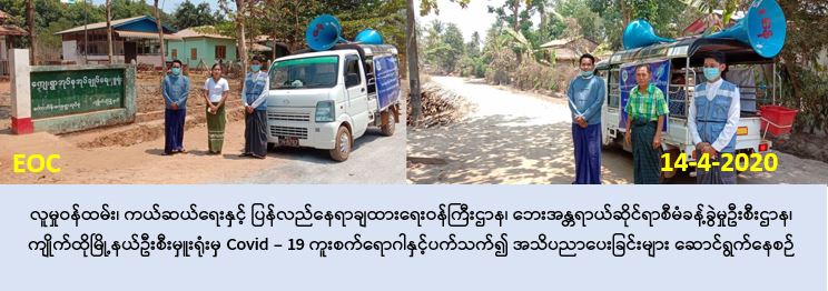 လူမှုဝန်ထမ်း၊ ကယ်ဆယ်ရေးနှင့် ပြန်လည်နေရာချထားရေးဝန်ကြီးဌာန၊ ဘေးအန္တရာယ်ဆိုင်ရာ စီမံခန့်ခွဲမှုဦးစီးဌာန၊ ကျိုက်ထိုမြို့နယ်ဦးစီးမှူးရုံးမှ တာဝန်ရှိသူများသည် (၁၄-၄-၂၀၂၀)ရက်နေ့၊ (၀၉:၀၀)အချိန်မှ (၁၅:၀၀) အချိန်ထိ သထုံခရိုင်၊ ကျိုက်ထိုမြို့နယ်၊ ကော့ဘိန်းကျေးရွာ၊ ကျွန်းတောကျေးရွာနှင့် ပျဉ်းမစခန်းကျေးရွာများအတွင်းရှိ လမ်းဆုံလမ်းခွများနှင့် လူစည်ကားရာနေရာများတွင် COVID -19 ကူးစက်ရောဂါနှင့်ပတ်သက်၍ ကြိုတင်ကာကွယ် ထိန်းချုပ်နိုင်ရန် ပြည်သူသို့ အသိပညာပေးပန်ကြားချက်များအား လှည့်လည်အသိပေး ကြေငြာခြင်းများဆောင်ရွက်ခဲ့ကြောင်း သတင်းရရှိပါသည်။
