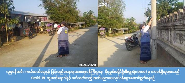 လူမှုဝန်ထမ်း၊ ကယ်ဆယ်ရေးနှင့် ပြန်လည်နေရာချထားရေးဝန်ကြီးဌာန၊ ဘေးအန္တရာယ်ဆိုင်ရာစီမံခန့်ခွဲမှု ဦးစီးဌာန၊ မိုးညှင်းခရိုင်ဦးစီးမှူးရုံးမှတာဝန်ရှိသူများသည် (၁၄-၄-၂၀၂၀) ရက်နေ့ (၁၅:၃၀) အချိန်၌ မိုးညှင်း မြို့နယ်၊ အင်းကုန်းကျေးရွာတွင် COVID-19 ကူးစက်ရောဂါနှင့်ပတ်သက်၍ ဆောင်ရန်၊ ရှောင်ရန် အချက် များ၊ လိုက်နာရမည့်အချက်များကို သိရှိစေရန်အတွက် အသိပညာပေးနှိုးဆော်ခြင်းများ ဆောင်ရွက်ခဲ့ ကြောင်း သိရှိရပါသည်။
