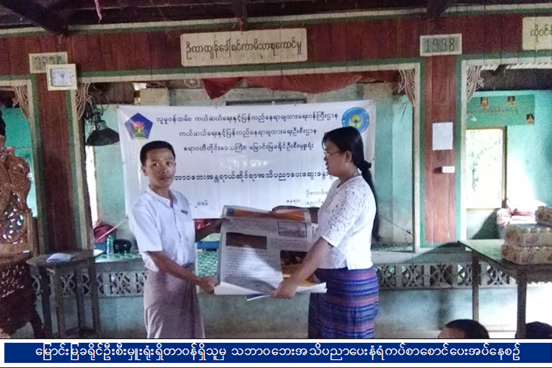 ကယ်ဆယ်ရေးနှင့် ပြန်လည်နေရာချထားရေးဦးစီးဌာန၊ မြောင်းမြခရိုင်ဦးစီးမှူးရုံးမှ တာ၀န် ရှိသူများသည် မြောင်းမြမြို့၊ ပိုးလောင်းကျေးရွာအုပ်စု၊ ညောင်းချောင်းလေးကျေးရွာတွင် ကျေးရွာ လူထု (၁၄၀)ဦးအား (၂၂-၆-၂၀၁၆)ရက်နေ့တွင် သဘာ၀ဘေးအသိပညာပေးဆွေးနွေးပွဲပြုလုပ်ခဲ့ ကြောင်းသတင်းရရှိပါသည်။