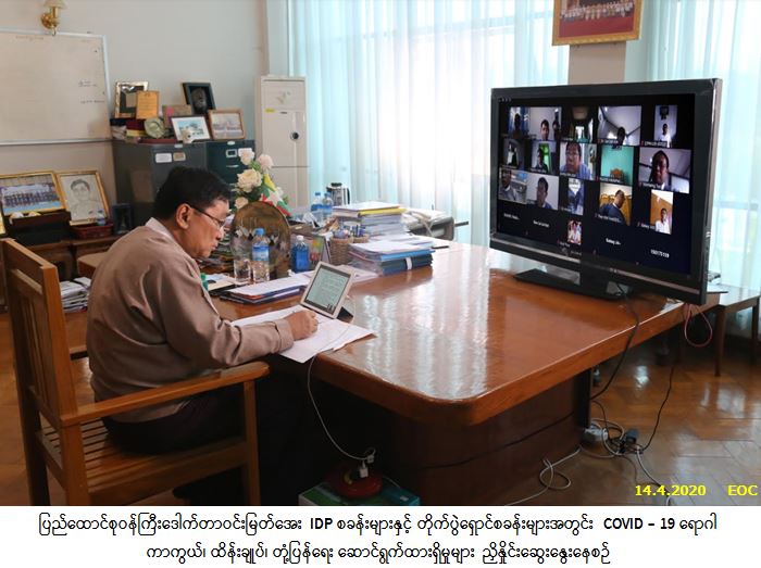 လူမှုဝန်ထမ်း၊ ကယ်ဆယ်ရေးနှင့် ပြန်လည်နေရာချထားရေးဝန်ကြီးဌာန၊ ပြည်ထောင်စုဝန်ကြီး ဒေါက်တာဝင်းမြတ်အေးသည် IDP စခန်းများနှင့် တိုက်ပွဲရှောင်စခန်းများအတွင်း နေထိုင်ကြသည့် ပြည်တွင်းနေရပ်စွန့်ခွာသူများအတွက် COVID – 19 ရောဂါ ကာကွယ်၊ ထိန်းချုပ်၊ တုံ့ပြန်ရေး ဆောင်ရွက်ထားရှိမှုများ ညှိနှိုင်းဆွေးနွေးခြင်းကို ယနေ့မွန်းလွဲပိုင်းက တာဝန်ရှိသူများနှင့် Video Conference ပြုလုပ်ခဲ့ပါသည်။