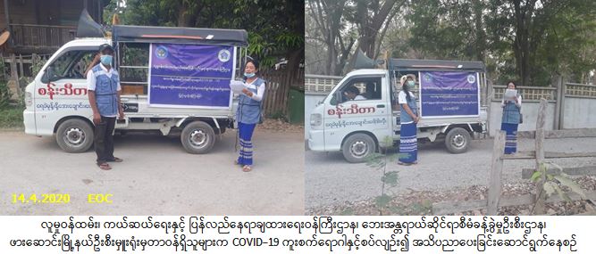 လူမှုဝန်ထမ်း၊ ကယ်ဆယ်ရေးနှင့် ပြန်လည်နေရာချထားရေးဝန်ကြီးဌာန၊ ဘေးအန္တရာယ်ဆိုင်ရာစီမံခန့်ခွဲမှုဦးစီး ဌာန၊ ဖားဆောင်းမြို့နယ်ဦးစီးမှူးရုံးမှတာဝန်ရှိသူများသည် (၁၄-၄-၂၀၂၀) ရက်နေ့တွင် ဖားဆောင်းမြို့နယ်၊ ဖားဆောင်းကျေးရွာအုပ်စု၊ တောင်ပေါ်ရွာ၌ COVID-19 ကူးစက်ရောဂါနှင့်စပ်လျဉ်း၍ ဆောင်ရန်/ရှောင်ရန် အချက်များကို အသိပညာပေးနှိုးဆော်ခဲ့ပါကြောင်း သတင်းရရှိပါသည်။