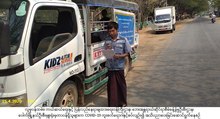 လူမှုဝန်ထမ်း၊ ကယ်ဆယ်ရေးနှင့် ပြန်လည်နေရာချထားရေးဝန်ကြီးဌာန၊ ဘေးအန္တရာယ်ဆိုင်ရာစီမံခန့်ခွဲမှုဦးစီး ဌာန၊ ပေါက်မြို့နယ်ဦးစီးမှူးရုံးမှ တာဝန်ရှိသူများသည် (၁၅-၄-၂၀၂၀) ရက်နေ့၊ (၀၉:၀၀) နာရီအချိန်မှ (၁၀:၃၀) နာရီအချိန်အထိ ပေါက်မြို့မြို့ပေါ်ရပ်ကွက်များဖြစ်သည့် အောင်တံခွန်၊ အောင်ချမ်းသာ၊ အောင်တော်မူ၊ ရွှေပေါက်ပင်ရပ်ကွက်များ၌ COVID-19 ကူးစက်ရောဂါနှင့်စပ်လျဉ်း၍ ဆောင်ရန်/ရှောင်ရန်အချက်များကို အသိပညာပေးနှိုးဆော်ခဲ့ပါကြောင်း သတင်းရရှိပါသည်။