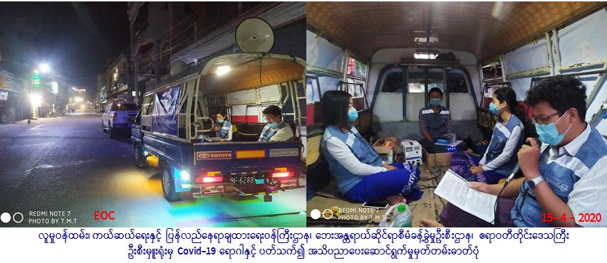 လူမှုဝန်ထမ်း၊ ကယ်ဆယ်ရေးနှင့်ပြန်လည်နေရာချထားရေးဝန်ကြီးဌာန၊ ဘေးအန္တရာယ်ဆိုင်ရာစီမံခန့်ခွဲမှုဦးစီးဌာန၊ ဧရာဝတီ တိုင်းဒေသကြီးဦးစီးမှူးရုံးမှ တာဝန်ရှိသူများသည် (၁၅–၄–၂၀၂၀) ရက်နေ့ (၁၇:၀၀)နာရီအချိန်မှစ၍ ပုသိမ်ခရိုင်၊ ပုသိမ်မြို့နယ်၊ အမှတ် (၁)ရပ်ကွက်၊ ရွှေဝါထွန်းလမ်းမကြီး၊ ငဝန်ကျွန်းသာအလယ်လမ်းမကြီးတို့၌လည်းကောင်း၊ အမှတ် (၂)ရပ်ကွက်၊ ရွှေစည်းခုံ လမ်း၊ ဦးလူလမ်း၊ မင်းကြီးလမ်းတို့၌လည်းကောင်း၊ အမှတ် (၄)ရပ်ကွက်၊ မြေနုလမ်း၊ ကုန်သည်လမ်းတို့၌လည်းကောင်း၊ အမှတ် (၆)ရပ်ကွက်၊ ဗလီလမ်း၌လည်းကောင်း လတ်တလောနိုင်ငံအသီးသီးတွင်ကူးစက် ပြန့်ပွားလျက်ရှိသော COVID-19 ကူးစက် ရောဂါနှင့်ပတ်သက်၍ ရပ်ကွက်နေပြည်သူများအား အသိပညာပေးဟောပြောခြင်းများ ဆောင်ရွက်ခဲ့ပါကြောင်း သတင်းရရှိပါ သည်။