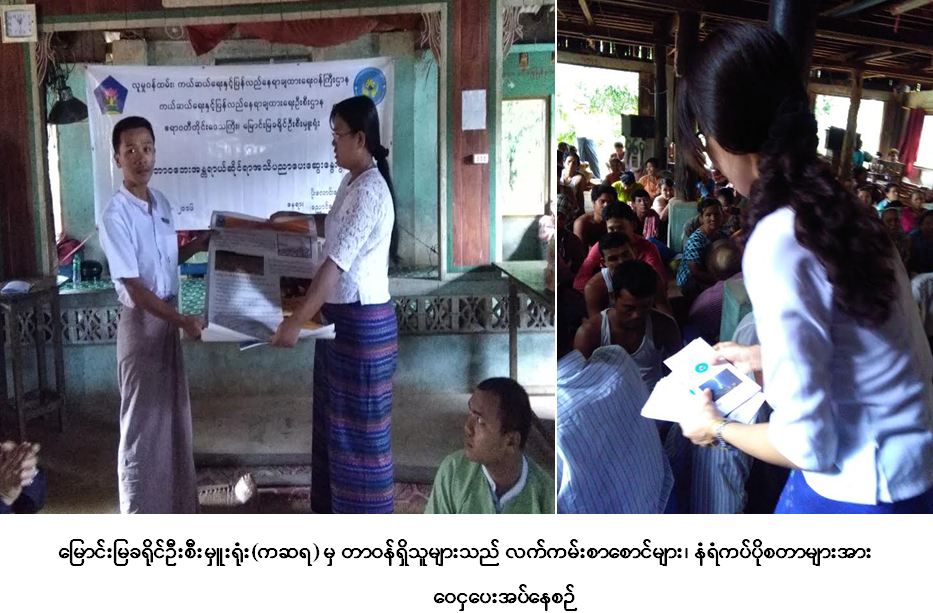 ကယ်ဆယ်ရေးနှင့် ပြန်လည်နေရာချထားရေးဦးစီးဌာန၊ မြိတ်ခရိုင်ဦးစီးမှူးရုံးမှ တာဝန်ရှိသူများသည် မြောင်းမြ မြို့ ပိုးလောင်းကျေးရွာအုပ်စု၊ ညောင်းချောင်းလေးကျေးရွာ၌ သဘာဝဘေးအန္တရာယ်ဆိုင်ရာ အသိပညာပေး ဟောပြောပွဲကို (၂၂-၆-၂၀၁၆) ရက်နေ့တွင် ပြုလုပ်ခဲ့ရာ ကျေးရွာလူထု (၁၄၀) ဦး တက်ရောက်ခဲ့ပါသည်။ အဆိုပါ အသိပညာပေးဟောပြောပွဲတွင် ပြည်သူလူထုအား မီးဘေး၊ လေဘေး၊ မိုးကြိုးဘေး၊ ရေဘေး ဆိုင်ရာများ ဆွေးနွေးခဲ့ပြီး၊ လက်ကမ်းစာစောင်များ၊ ကျေးရွာအုပ်ချုပ်ရေးမှူးအား ဘေး (၈) မျိုး ပိုစတာနှင့် ဥပဒေစာအုပ် များ ပေးအပ်ခဲ့ကြောင်း သတင်းရရှိပါသည်။