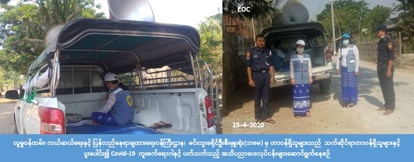 လူမှုဝန်ထမ်း၊ ကယ်ဆယ်ရေးနှင့် ပြန်လည်နေရာချထားရေးဝန်ကြီးဌာန၊ ဘေးအန္တရာယ်ဆိုင်ရာစီမံခန့်ခွဲ မှုဦးစီးဌာန၊ မင်းဘူးခရိုင်ဦးစီးမှူးရုံးမှ တာဝန်ရှိသူများသည် (၁၅-၄-၂၀၂၀) ရက်နေ့တွင် မင်းဘူး (စကု) မြို့ နယ်၊ တောဘို့ကုန်းကျေးရွာ၊ ထနောင်းတောကျေးရွာ၊ ဘုမ္မနိုးကျေးရွာ၊ ခန်ကုန်းကျေးရွာ၊ ပေါင်းကျေးရွာ၊ တောကျောင်းကုန်းကျေးရွာ၊ မကျီးချောင်းကျေးရွာနှင့် ပန်းလွှားကျေးရွာများအတွင်း Covid-19 ရောဂါ ကူးစက်ပျံ့နှံ့မှုမဖြစ်ပွားစေရန် သိရှိလိုက်နာဆောင်ရွက်ရမည့်အချက်များကို ခရိုင်မီးသတ်ဦးစီးဌာနမှ တာဝန်ရှိသူများ၊ကျေးရွာအုပ်ချုပ်ရေးမှူးများ၊ ရပ်မိရပ်ဖများနှင့်ပူးပေါင်း၍ အသိပညာပေး ဟောပြောခဲ့ကြောင်း သိရှိရပါသည်။