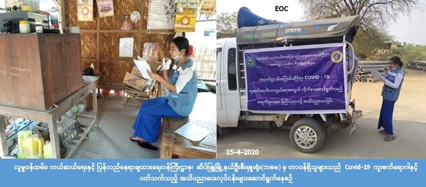 လူမှုဝန်ထမ်း၊ ကယ်ဆယ်ရေးနှင့် ပြန်လည်နေရာချထားရေးဝန်ကြီးဌာန၊ ဘေးအန္တရာယ်ဆိုင်ရာ စီမံခန့်ခွဲမှု ဦးစီးဌာန၊ မကွေးတိုင်းဒေသကြီး၊ ပခုက္ကူခရိုင်၊ ဆိပ်ဖြူမြို့နယ်ဦးစီးမှူးရုံးမှတာဝန်ရှိသူများသည် (၁၅-၄-၂၀၂၀)ရက်နေ့ နံနက် (၀၈:၀၀) အချိန်မှ (၁၃:၀၀) အချိန်အထိ ကျေးရွာအုပ်ချုပ်ရေးမှူးများ၊ ရပ်ကျေး စာရေးနှင့်အတူပူးပေါင်း၍ ပေတောကျေးရွာအုပ်စုရှိ ပေတောကျေးရွာ၊ ဆူးပုတ်ကုန်းကျေးရွာနှင့် ကဇွဲ ကျေးရွာ၊ ရွာသစ်ကြီးကျေးရွာအုပ်စုရှိ ရွာသစ်ကြီးကျေးရွာ၊ ချတောင့်ကျေးရွာနှင့် နဘဲကန်ကျေးရွာ တို့တွင် လှည့်လည်၍ Covid-19 ရောဂါနှင့်ပတ်သက်၍ ဆောင်ရန်၊ ရှောင်ရန်အချက်များအား အသိပညာ ပေးခြင်းများ ဆောင်ရွက်ခဲ့ကြောင်း သိရှိရပါသည်။