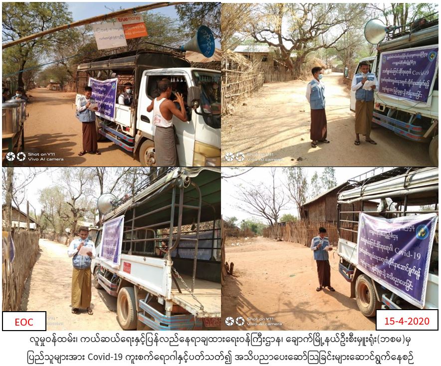 လူမှုဝန်ထမ်း၊ ကယ်ဆယ်ရေးနှင်ပြန်လည်နေရာချထားရေးဝန်ကြီးဌာန၊ ဘေးအန္တရာယ်ဆိုင်ရာစီမံခန့်ခွဲမှုဦးစီးဌာန၊ ချောက်မြို့နယ်ဦးစီးမှူးရုံးမှ တာဝန်ရှိသူများသည် (၁၅-၄-၂၀၂၀)ရက်နေ့တွင် ချောက်မြို့နယ်အတွင်းရှိ ကန်ရေလေးကျေးရွာနှင့် ကပေါင်းစမ်းကျေးရွာများသို့ covid 19ရောဂါ ကာကွယ်ထိန်းချုပ်ရေးနှင့် အသိပညာပေးခြင်းကို ဆောင်ရွက်ခဲ့ကြောင်း သတင်းရရှိပါသည်။