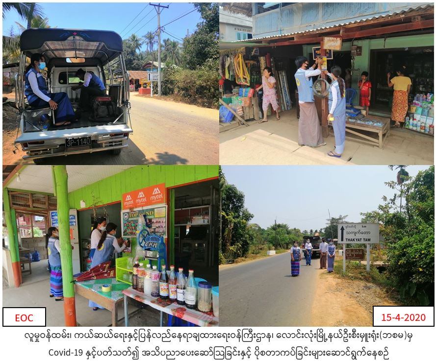 လူမှုဝန်ထမ်း၊ ကယ်ဆယ်ရေးနှင့်ပြန်လည်နေရာချထားရေးဝန်ကြီးဌာန၊ ဘေးအန္တရာယ်ဆိုင်ရာစီမံခန့်ခွဲမှုဦးစီးဌာန၊ လောင်းလုံးမြို့နယ်ဦးစီးမှူးရုံးနှင့် တနင်္သာရီတိုင်းဒေသကြီးဦးစီးမှူးရုံးတာ၀န်ရှိသူများပူးပေါင်း၍ (၁၅.၄. ၂၀၂၀)ရက်နေ့၌ တနင်္သာရီတိုင်းဒေသကြီး၊ ထား၀ယ်ခရိုင် ၊ လောင်းလုံးမြို့နယ်၊ သကျက်တောကျေးရွာ၊ အောက်ရေဖြူကျေးရွာ၊ ညှင်းမော်ကျေးရွာတို့တွင် လော်စပီကာတို့ဖြင့် (Covid-19) လတ်တလော အသက်ရှူလမ်းကြောင်းဆိုင်ရာရောဂါ ကြိုတင်ကာကွယ် ထိန်းချုပ်နိုင်ရန် အများပြည်သူသို့ အသိပညာပေးပန်ကြားချက်များအား လှည့်လည်ကြေညာခြင်းနှင့် အသိပညာပေး ပိုစတာများ ကပ်ခြင်းတို့ကို ဆောင်ရွက်ခဲ့ကြောင်း သတင်းရရှိပါသည်။