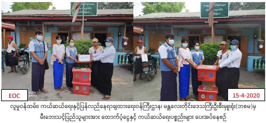 လူမှုဝန်ထမ်း၊ ကယ်ဆယ်ရေးနှင့် ပြန်လည်နေရာချထားရေးဝန်ကြီးဌာန၊ ဘေးအန္တရာယ်ဆိုင်ရာစီမံခန့်ခွဲမှုဦးစီးဌာန၊ မန္တလေးတိုင်းဒေသကြီးဦးစီးမှူးရုံးမှ တာဝန်ရှိသူများသည် ပုသိမ်ကြီးမြို့နယ်၊ အုန်းချောကျေးရွာ၊အမှတ်(၄)ရပ်ကွက်တွင် (၁၁-၄-၂၀၂၀)ရက်နေ့ (၁၇း၂၅)အချိန်၌ ဖြစ်ပွားခဲ့သောမီးဘေးကြောင့် ဘေးသင့်အိမ်ခြေ(၃)အိမ်၊ အိမ်ထောင်စု(၂)စု၊ လူဦးရေ(၃)ဦးအတွက် အိမ်ဆောက်ပစ္စည်းဖိုးငွေကျပ် (၃၀၀၀၀၀)၊ ဆန်ရိက္ခာဖိုးငွေကျပ် (၆၃၀၀)၊ ဒဏ်ရာရထောက်ပံ့ငွေကျပ် (၅၀၀၀၀)နှင့် ကယ်ဆယ်ရေးပစ္စည်း (၁၆)မျိုးပါ အိမ်ထောင်စု (၂)စုစာအား (၁၃-၄-၂၀၂၀)ရက်နေ့ (၁၆း၀၀)အချိန်တွင် သွားရောက်ထောက်ပံ့ခဲ့ကြောင်း သတင်းရရှိပါသည်။