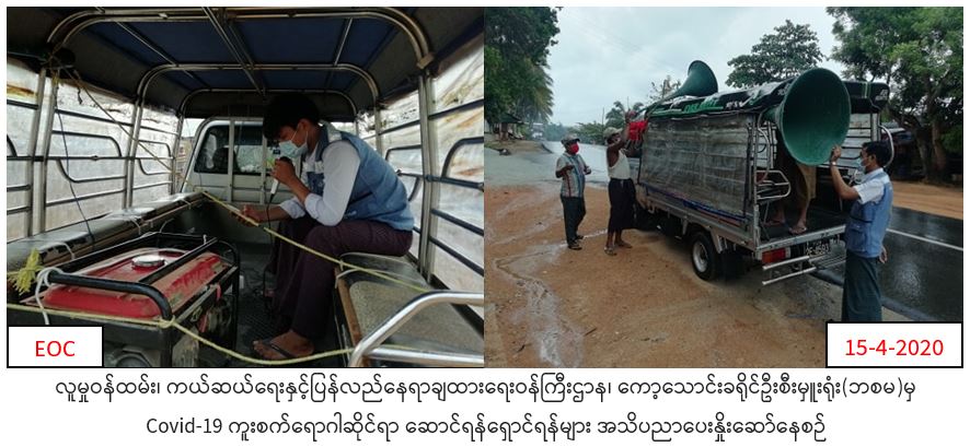 လူမှုဝန်ထမ်း၊ ကယ်ဆယ်ရေးနှင့်ပြန်လည်နေရာချထားရေးဝန်ကြီးဌာန၊ ဘေးအန္တရာယ်ဆိုင်ရာစီမံခန့်ခွဲမှုဦးစီးဌာန၊ ကော့သောင်းခရိုင်ဦးစီးမှူးရုံးမှ (၁၅.၄.၂၀၂၀)ရက်နေ့ ကော့သောင်းမြို့၊ ရွှေပြည်သာရပ်ကွက်အတွင်းရှိ ပြည်သူများအား covid19 ရောဂါနှင့်ပက်သက်၍ အသိပညာပေးခြင်း၊ လော်စပီကာ၊ Hand Speaker ဖြင့် လိုက်လံဆော်ြသခြင်းများ ဆောင်ရွက်ခဲ့ကြောင်း သတင်းရရှိပါသည်။