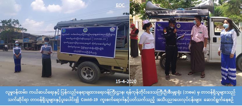 ရန်ကုန်မြောက်ပိုင်းခရိုင်၊ လှိုင်သာယာမြို့နယ်၊ အမှတ်(၅,၆,၇,၈,၉) ရပ်ကွက်၊ အလယ်ရွာ၊ ရိုးကြီးရွာ၊ ရိုးလေးရွာများ တွင်၎င်း၊ ရန်ကုန်တောင်ပိုင်းခရိုင်၊ ကော့မှူးမြို့နယ်၊ နတ်စဉ်ကုန်းကျေးရွာအုပ်စု၊အဖျောက်ကျေးရွာအုပ်စု၊ ပိန္နဲကုန်း ကျေးရွာအုပ်စု၊ လက်ခိုက်ကျေးရွာအုပ်စု၊ လာဝတီကျေးရွာအုပ်စုတို့တွင်၎င်း Covid-19 အသက်ရှူလမ်းကြောင်းဆိုင်ရာ ရောဂါနှင့်ပတ်သက်၍ အများပြည်သူများသိရှိလိုက်နာရန်အချက်များအား ကွင်းဆင်း၍ ကျန်းမာရေးနှင့် အားကစား ဝန်ကြီးဌာနမှ ထုတ်ပြန်ထားသော အသိပေးကြေငြာချက်များ၊ လူမှုဝန်ထမ်း၊ ကယ်ဆယ်ရေးနှင့် ပြန်လည်နေရာချထား ရေးဝန်ကြီးဌာနမှထုတ်ပြန်ထားသော ဥပဒေများကိုလိုက်နာရန် အသိပေးကြေငြာချက်များအား (၁၅-၄-၂၀၂၀) ရက် နေ့တွင် လူမှုဝန်ထမ်း၊ ကယ်ဆယ်ရေးနှင့် ပြန်လည်နေရာချထားရေးဝန်ကြီးဌာန၊ ဘေးအန္တရာယ်ဆိုင်ရာစီမံခန့်ခွဲမှု ဦးစီးဌာန၊ ရန်ကုန်တိုင်းဒေသကြီးဦးစီးမှူးရုံးမှ အရာထမ်း၊ အမှုထမ်းများသည် ရပ်ကွက်များအတွင်း သက်ဆိုင်ရာ ကျန်းမာရေးဉီးစီးဌာန၊ အထွေထွေအုပ်ချုပ်ရေးဦးစီးဌာနမှ တာဝန်ရှိသူများနှင့်အတူ ကြော်ငြာခြင်းများ ပြုလုပ်ခဲ့ ကြောင်း သိရှိရပါသည်။