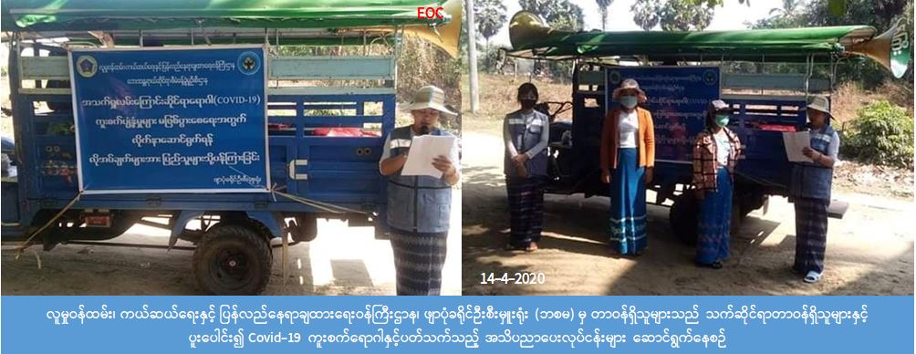 လူမှုဝန်ထမ်း၊ ကယ်ဆယ်ရေးနှင့် ပြန်လည်နေရာချထားရေးဝန်ကြီးဌာန၊ ဘေးအန္တရာယ်ဆိုင်ရာစီမံခန့်ခွဲမှုဦးစီးဌာန၊ ဖျာပုံခရိုင်ဦးစီးမှူးရုံးမှတာဝန်ရှိသူများသည် (၁၄-၄-၂၀၂၀) ရက်နေ့တွင် ဒေးဒရဲမြို့နယ်၊ချောင်းဖျားကျေးရွာ၊ စဉ့်ကူး ကျေးရွာ၊ ကျုံသင်ကျေးရွာများ၌ ခရိုင်လူမှုဝန်ထမ်းဉီးစီးဌာနမှတာဝန်ရှိသူတို့နှင့်အတူ COVID-19 ရောဂါ ကူးစက် ပျံ့နှံ့မှုများ မဖြစ်ပွားစေရေးအတွက် လိုက်နာဆောင်ရွက်ရန်များကို ကျေးရွာရှိပြည်သူများအား အသိပညာပေးခြင်း လုပ်ငန်းများဆောင်ရွက်ခဲ့ပါသည်။