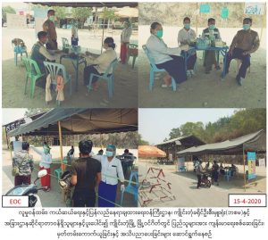 လူမှုဝန်ထမ်း၊ ကယ်ဆယ်ရေးနှင့်ပြန်လည်နေရာချထားရေးဝန်ကြီးဌာန၊ ဘေးအန္တရာယ်ဆိုင်ရာစီမံခန့်ခွဲမှုဦးစီးဌာန၊ ကျိုင်းတုံခရိုင်ဦးစီးမှူးရုံးမှ တာ၀န်ရှိသူများသည် (၁၅ – ၄ -၂၀၂၀) နံနက်(၈း၀၀) နာရီ အချိန်မှ (၁၈း၀၀ )နာရီအချိန်ထိ မြို့နယ်အထွေထွေအုပ်ချုပ်ရေးဦးစီးဌာန၊ မြို့နယ်ပြည်သူ့ကျန်းမာရေးဦးစီးဌာန၊ မြို့နယ်ကြက်ခြေနီအသင်းတို့နှင့် ပူပေါင်း၍ ကျိုင်းတုံ-တာချီလိတ်လမ်း၊ နောင်နွန်းစုပေါင်းဂိတ်တွင် ကျိုင်းတုံမြို့တွင်းသို့ အ၀င်အထွက်ယာဥ်လိုင်းများတွင် စီးနှင်းလိုက်ပါသော ခရီးသည်များအား COVID-19 ရောဂါပတ်သက်၍ ကျန်းမာရေးစစ်ဆေးခြင်း၊ မှတ်တမ်းကောက်ယူခြင်း၊ အသိပညာပေးခြင်းတို့ကို ဆောင်ရွက်လျှက်ရှိကြောင်း သတင်းရရှိပါသည်။