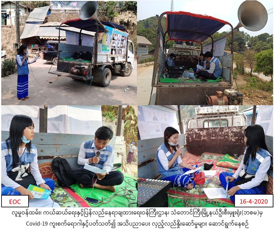 လူမှုဝန်ထမ်း၊ ကယ်ဆယ်ရေးနှင့်ပြန်လည်နေရာချထားရေးဝန်ကြီးဌာန၊ ဘေးအန္တရာယ်ဆိုင်ရာစီမံခန့်ခွဲမှုဦးစီးဌာန၊ သံတောင်ကြီးမြို့နယ်ဦးစီးမှူးရုံးမှ တာဝန်ရှိသူများသည် (၁၆. ၄.၂၀၂၀)ရက်နေ့ မနက်(၉:၀၀)အချိန်မှ နေ့လည် (၁၁:၀၀)အချိန်ထိ သံတောင်ကြီးမြို့နယ်အတွင်းရှိ တောပြာကြီးကျေးရွာနှင့် ရွှေညောင်ပင်ကျေးရွာများသို့ COVID -(19) ရောဂါပျံ့နှံ့မှုများ မဖြစ်ပွားစေရန်အတွက် အသံချဲ့စက်ဖြင့် အသိပညာပေးဟောပြောခြင်းများ ဆောင်ရွက်ခဲ့ကြောင်း သတင်းရရှိပါသည်။