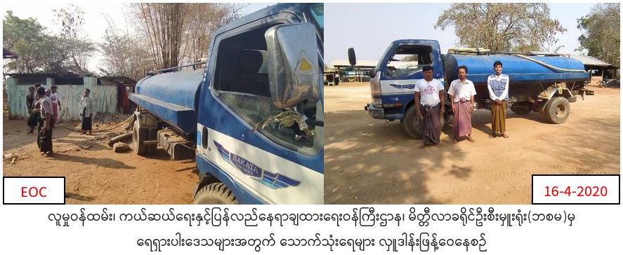 လူမှုဝန်ထမ်း၊ ကယ်ဆယ်ရေးနှင့်ပြန်လည်နေရာချထားရေးဝန်ကြီးဌာန၊ဘေးအန္တရာယ်ဆိုင်ရာစီမံခန့်ခွဲမှုဦးစီးဌာန၊ မိတ္ထီလာခရိုင်ဦးစီးရုံးမှ တာဝန်ရှိသူများသည် (၁၆.၄.၂၀၂၀)ရက်နေ့တွင် မိတ္ထီလာမြို့နယ်၊ ဇရပ်ကုန်းကျေးရွာအုပ်စု၊ ဆူးရစ်တန်းကျေးရွာတွင် ရေရှားပါးမှုဖြစ်ပေါ်နေခြင်းအတွက် သောက်သုံးရေဂါလန်(၁၆၀၀)ကို သွားရောက်လှူဒါန်းထောက်ပံ့ပေးခဲ့ကြောင်း သတင်းရရှိပါသည်။
