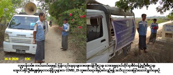 လူမှုဝန်ထမ်း၊ ကယ်ဆယ်ရေးနှင့် ပြန်လည်နေရာချထားရေးဝန်ကြီးဌာန၊ ဘေးအန္တရာယ်ဆိုင်ရာစီမံခန့်ခွဲမှုဉီးစီးဌာန၊ မအူပင်ခရိုင်ဦးစီးမှူးရုံးမှတာဝန်ရှိသူများသည် (၁၆-၄-၂၀၂၀) ရက်နေ့တွင် မအူပင်မြို့နယ်၊ ကျီးချောင်းကျေးရွာအုပ်စု အတွင်းရှိ ကျေးရွာခွဲ (၄) ရွာ၌ COVID-19 ကူးစက်ရောဂါနှင့်စပ်လျဉ်း၍ ဆောင်ရန်/ရှောင်ရန်အချက်များကို Loud Speaker ၊ Hand Speaker များဖြင့် လှည့်လည်အသိပညာပေး နှိုးဆော်ခဲ့ပါကြောင်း သတင်းရရှိိပါသည်။