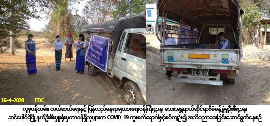 လူမှုဝန်ထမ်း၊ ကယ်ဆယ်ရေးနှင့် ပြန်လည်နေရာချထားရေးဝန်ကြီးဌာန၊ ဘေးအန္တရာယ်ဆိုင်ရာစီမံခန့်ခွဲမှုဉီးစီးဌာန၊ ဆင်ပေါင်ဝဲမြို့နယ်ဦးစီးမှူးရုံးမှတာဝန်ရှိသူများသည် (၁၆-၄-၂၀၂၀) ရက်နေ့၊ (၀၉:၀၀)နာရီအချိန်တွင် ဆင်ပေါင်ဝဲမြို့နယ်၊ ဓနုန်းမြောင်ကျေးရွာအုပ်စု၊ ဓနုန်းမြောင်ကျေးရွာ၊ ဇိမ့်ကုန်းကျေးရွာ၊ ဥသျှစ်ကုန်းကျေးရွာများ၌ ပြန်ကြားရေးနှင့်ပြည်သူ့ဆက်ဆံရေးဦးစီးဌာနနှင့်ပူးပေါင်း၍ COVID-19 ကူးစက်ရောဂါနှင့်စပ်လျဉ်း၍ ဆောင်ရန်/ရှောင်ရန်အချက်များကို အသိပညာပေးနှိုးဆော်ခဲ့ပါကြောင်း သတင်းရရှိိပါသည်။
