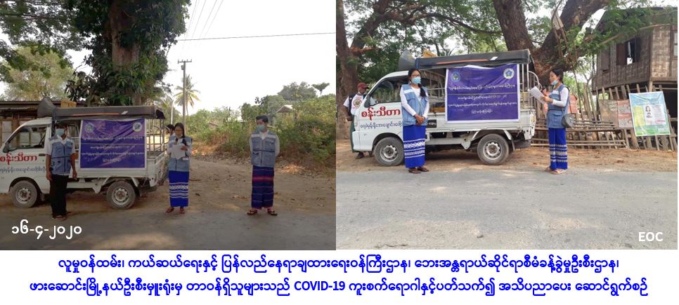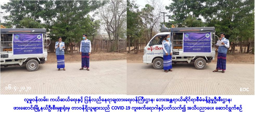 လူမှုဝန်ထမ်း၊ ကယ်ဆယ်ရေးနှင့် ပြန်လည်နေရာချထားရေးဝန်ကြီးဌာန၊ ဘေးအန္တရာယ်ဆိုင်ရာစီမံ ခန့်ခွဲမှုဦးစီးဌာန၊ ဖားဆောင်းမြို့နယ်ဦးစီးမှူးရုံးမှ တာဝန်ရှိသူများသည် (၁၆-၄-၂၀၂၀) ရက်နေ့တွင် ဖားဆောင်းကျေးရွာအုပ်စု၊ ခဲမဖြူကျေးရွာနှင့် နန်းဟူကုန်းကျေးရွာရှိ မိဘပြည်သူများအား COVID-19 ရောဂါကူးစက်ပြန့်နှံ့မှုများ မဖြစ်ပွားစေရန်အတွက် သိရှိလိုက်နာဆောင်ရွက်ရမည့်အချက်များနှင့်ပတ်သက်၍ အသိပညာပေးခြင်းများ ဆောင်ရွက်ခဲ့ကြောင်း သတင်းရရှိပါသည်။