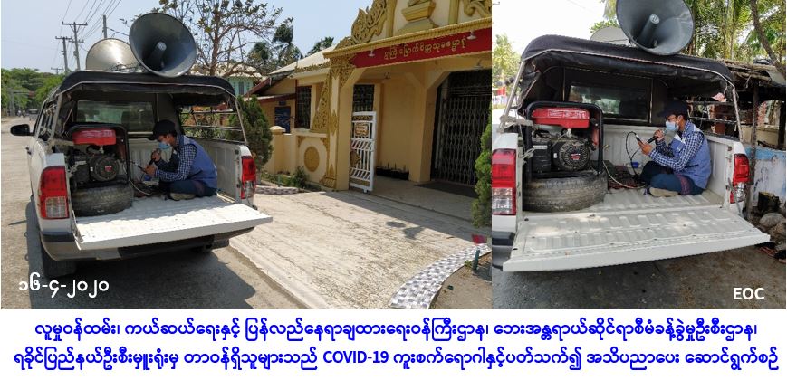 လူမှုဝန်ထမ်း၊ ကယ်ဆယ်ရေးနှင့် ပြန်လည်နေရာချထားရေးဝန်ကြီးဌာန၊ ဘေးအန္တရာယ်ဆိုင်ရာစီမံ ခန့်ခွဲမှုဦးစီးဌာန၊ ရခိုင်ပြည်နယ်ဦးစီးမှူးရုံးမှ တာဝန်ရှိသူများသည် (၁၆-၄-၂၀၂၀) ရက်နေ့၊ (၁၁:၀၀) နာရီအချိန်မှ (၁၆:၃၀) နာရီအချိန်ထိ စစ်တွေမြို့ပေါ်ရပ်ကွက်များ၌ COVID-19 ရောဂါကူးစက်ပြန့်နှံ့မှုများ မဖြစ်ပွားစေရန်အတွက် သိရှိလိုက်နာဆောင်ရွက်ရမည့်အချက်များနှင့်ပတ်သက်၍ အသိပညာပေးခြင်းများကို မနက် (၁) ကြိမ်၊ ညနေ (၁) ကြိမ် ဆောင်ရွက်ခဲ့ကြောင်း သတင်းရရှိပါသည်။