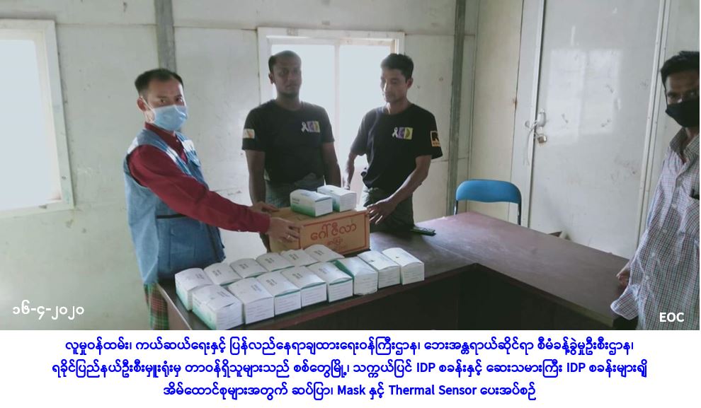 လူမှုဝန်ထမ်း၊ ကယ်ဆယ်ရေးနှင့် ပြန်လည်နေရာချထားရေးဝန်ကြီးဌာန၊ ဘေးအန္တရာယ်ဆိုင်ရာစီမံခန့်ခွဲမှုဦးစီးဌာန၊ ရခိုင်ပြည်နယ်ဦးစီးမှူးရုံးမှ တာဝန်ရှိသူများသည် (၁၆-၄-၂၀၂၀) ရက်နေ့၊ (၁၅:၃၀) နာရီအချိန်တွင် စစ်တွေမြို့၊ သက္ကယ်ပြင် IDP စခန်းရှိ အိမ်ထောင်စု (၁၀၀၀) အတွက် ဆပ်ပြာ(၁၀၀၀)တောင့်၊ Mask (၂၀၀၀)ခုနှင့် Thermal Sensor (၁)ခုတို့ကိုလည်းကောင်း၊ (၁၆:၃၀) နာရီအချိန်တွင် ဆေးသမားကြီး IDP စခန်းရှိ အိမ်ထောင်စု (၁၈၂၃) စုအတွက် ဆပ်ပြာ(၁၈၂၃)တောင့်၊ Mask (၃၆၄၆)ခုနှင့် Thermal Sensor (၁)ခုတို့ကိုလည်းကောင်း ပေးအပ်ခဲ့ကြောင်း သတင်းရရှိပါသည်။