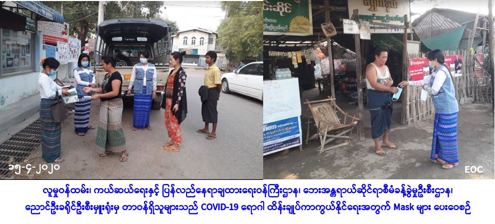 လူမှုဝန်ထမ်း၊ ကယ်ဆယ်ရေးနှင့် ပြန်လည်နေရာချထားရေးဝန်ကြီးဌာန၊ ဘေးအန္တရာယ်ဆိုင်ရာစီမံ ခန့်ခွဲမှုဦးစီးဌာန၊ ညောင်ဦးခရိုင်ဦးစီးမှူးရုံးမှ တာဝန်ရှိသူများသည် ခရိုင်ပြန်ကြားရေးနှင့် ပြည်သူ့ဆက်ဆံရေးဦးစီးဌာနမှ ဝန်ထမ်းများနှင့်အတူ (၁၅-၄-၂၀၂၀) ရက်နေ့၊ (၁၂း၀၀) နာရီမှ (၁၈း၀၀) နာရီအထိ ညောင်ဦးမြို့ပေါ်ရှိ ရေဝင်ရပ်ကွက်၊ သာယာဝတီရပ်ကွက်၊ သီရိမင်္ဂလာရပ်ကွက်၊ သီလရင်စုရပ်ကွက်၊ ဝက်ကြီးအင်းရပ်ကွက်၊ အောင်သပြေရပ်ကွက်နှင့် မဏိစည်သူဈေးတို့တွင် COVID-19 ရောဂါ ထိန်းချုပ်ကာကွယ်နိုင်ရေးအတွက် ရပ်ကွက်နေ ပြည်သူများအား Mask များ ပေးဝေခဲ့ပြီး အပြင်ထွက်သည့်အခါ မဖြစ်မနေ Mask တပ်ဆင်ပေးကြရန် တိုက်တွန်းနှိုးဆော်ခဲ့ကြောင်း သတင်းရရှိပါသည်။
