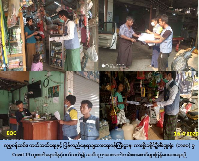 လူမှုဝန်ထမ်း၊ ကယ်ဆယ်ရေးနှင့် ပြန်လည်နေရာချထားရေးဝန်ကြီးဌာန၊ ဘေးအန္တရာယ်ဆိုင်ရာ စီမံခန့်ခွဲမှုဦးစီးဌာန၊ လားရှိုးခရိုင်ဦးစီးမှူးရုံးမှ တာဝန်ရှိသူများသည် (၁၆-၄-၂၀၂၀) ရက်နေ့တွင် ရပ်ကွက်(၉)၊ ရပ်ကွက်(၁၀)လားရှိုးမြို့၌ Covid-19 ရောဂါကူးစက်ပျံ့နှံ့မှုမဖြစ်ပွားစေရန် သိရှိလိုက်နာ ဆောင်ရွက်ရမည့်အချက်များကို အသိပေးဟောပြောခြင်း၊ လက်ကမ်းစာစောင်များ ဖြန့်ဝေခြင်းများကိုဆောင်ရွက်ခဲ့ပါသည်။