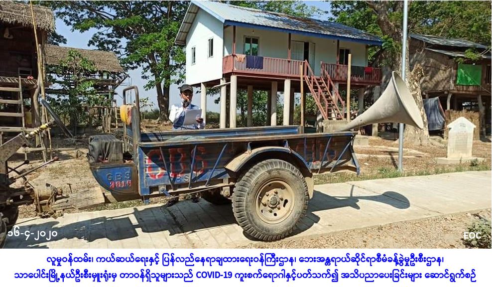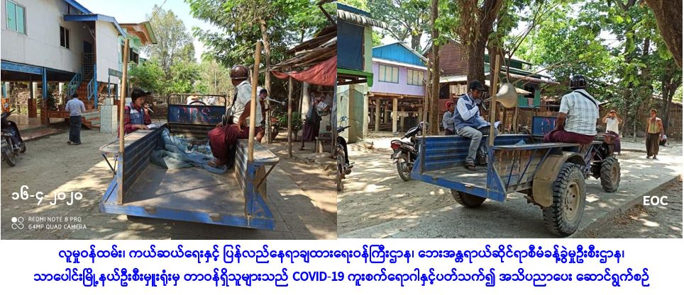 လူမှုဝန်ထမ်း၊ ကယ်ဆယ်ရေးနှင့် ပြန်လည်နေရာချထားရေးဝန်ကြီးဌာန၊ ဘေးအန္တရာယ်ဆိုင်ရာစီမံ ခန့်ခွဲမှုဦးစီးဌာန၊ သာပေါင်းမြို့နယ်ဦးစီးမှူးရုံးမှ တာဝန်ရှိသူများသည် (၁၆-၄-၂၀၂၀) ရက်နေ့၊ (၁၀:၃၀) နာရီအချိန်တွင် ပုသိမ်ခရိုင်၊ သာပေါင်းမြို့နယ်၊ ဂုံညင်းတန်းကျေးရွာ၌ COVID-19 ကူးစက် ရောဂါနှင့်ပတ်သက်ပြီး ဆောင်ရန်/ရှောင်ရန်များကို ကျေးရွာ/ရပ်ကွက်နေပြည်သူတို့အား အသိပညာပေးဟောပြောခြင်းများကို ကျေးရွာအုပ်စုအုပ်ချုပ်ရေးမှူး၊ ရပ်မိရပ်ဖများနှင့် ကျေးရွာရှိတာ၀န်ရှိသူများနှင့်အတူ ဆောင်ရွက်ခဲ့ကြောင်း သတင်းရရှိပါသည်။