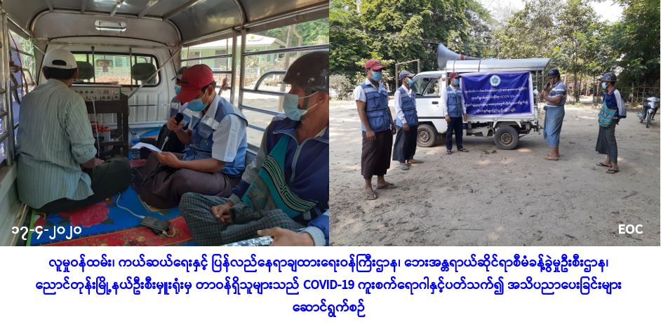 လူမှုဝန်ထမ်း၊ ကယ်ဆယ်ရေးနှင့် ပြန်လည်နေရာချထားရေးဝန်ကြီးဌာန၊ ဘေးအန္တရာယ်ဆိုင်ရာစီမံ ခန့်ခွဲမှုဦးစီးဌာန၊ ညောင်တုန်းမြို့နယ်ဦးစီးမှူးရုံးမှ တာဝန်ရှိသူများသည် (၁၇-၄-၂၀၂၀) ရက်နေ့တွင် ညောင်တုန်းမြို့နယ်၊ ထိပ်ဝကြီးကျေးရွာအုပ်စုအတွင်းရှိ ကျေးရွာ (၇) ရွာ၌ COVID-19 ကာကွယ်၊ တားဆီး၊ ထိန်းချုပ်၊ ကုသရေးဆိုင်ရာ အသိပညာပေး အသံဖိုင်အား ဖွင့်လှစ်၍ အသိပညာပေးခြင်းများ လှည့်လည် ဆောင်ရွက်ခဲ့ကြောင်း သတင်းရရှိပါသည်။
