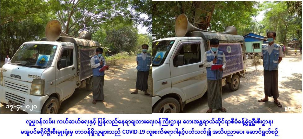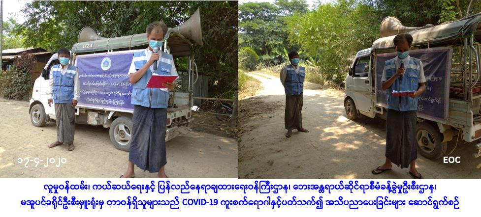 လူမှုဝန်ထမ်း၊ ကယ်ဆယ်ရေးနှင့် ပြန်လည်နေရာချထားရေးဝန်ကြီးဌာန၊ ဘေးအန္တရာယ်ဆိုင်ရာစီမံ ခန့်ခွဲမှုဦးစီးဌာန၊ မအူပင်ခရိုင်ဦးစီးမှူးရုံးမှ တာဝန်ရှိသူများသည် (၁၇-၄-၂၀၂၀) ရက်နေ့တွင် မအူပင်မြို့နယ်၊ မင်းဘောကျေးရွာအုပ်စုအတွင်းရှိ ကျေးရွာခွဲ(၃)ရွာ၌ COVID-19 ရောဂါ ကူးစက်ပျံ့ပွားမှုများ မဖြစ်ပွားစေရန်တွက် အများပြည်သူ သိရှိလိုက်နာဆောင်ရွက်ရန်အချက်များအား Loud Speaker, Hand Speaker များဖြင့် လှည့်လည်ဟောပြောခြင်းများ ဆောင်ရွက်ခဲ့ကြောင်း သတင်းရရှိပါသည်။