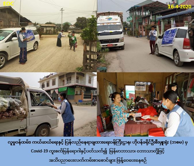 လူမှုဝန်ထမ်း၊ ကယ်ဆယ်ရေးနှင့် ပြန်လည်နေရာချထားရေးဝန်ကြီးဌာန၊ ဘေးအန္တရာယ်ဆိုင်ရာစီမံခန့်ခွဲမှုဦးစီးဌာန၊ ဟိုပန်ခရိုင်ဦးစီးမှူးရုံးမှ တာဝန်ရှိသူများသည် (၁၆-၄-၂၀၂၀) ရက်နေ့တွင် (COVID-19 ) အသက်ရှူလမ်းကြောင်းဆိုင်ရာရောဂါ အသိပညာပေးခြင်းကို ဟိုပန်မြို့၊ မန်ခွန်ရပ်ကွက်နှင့် စျေးရပ်ကွက်တို့တွင်ထပ်မံ လှည့်လှည်၍ အသိပညာပေးဆောင်ရွက်ခဲ့ပြီး မြန်မာဘာသာ၊ ဝဘာသာတို့ဖြင့် လက်ကမ်းစာစောင်များ ဖြန့်ဝေခြင်းတို့ကို ဆောင်ရွက်ခဲ့ပါကြောင်း သိရှိရပါသည်။