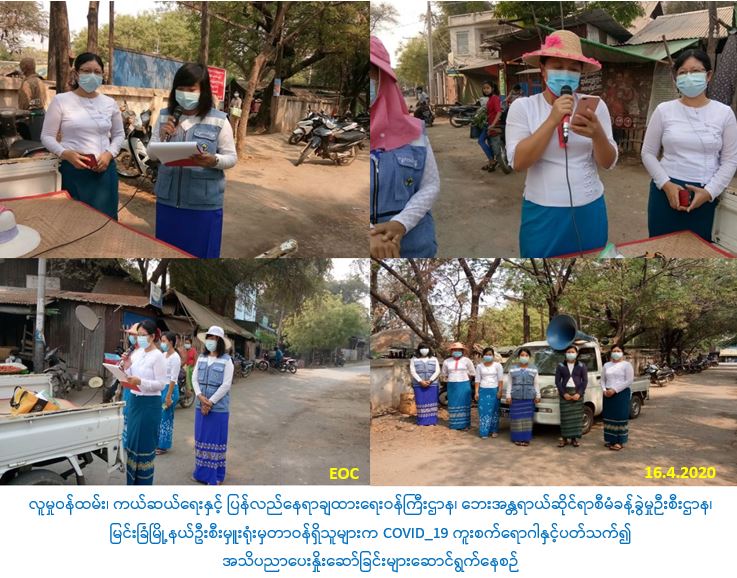 လူမှုဝန်ထမ်း၊ ကယ်ဆယ်ရေးနှင့် ပြန်လည်နေရာချထားရေးဝန်ကြီးဌာန၊ ဘေးအန္တရာယ်ဆိုင်ရာစီမံခန့်ခွဲမှုဦးစီးဌာန၊ မြင်းခြံမြို့နယ်ဦးစီးမှူးရုံးမှ တာဝန်ရှိသူများသည် ခရိုင်လူမှုဝန်ထမ်းဦးစီးဌာန၊ မြို့နယ်ပြန်ကြားရေးနှင့် ပြည်သူ့ဆက်ဆံရေးဦးစီးဌာနမှ တာဝန်ရှိသူများနှင့် ပူးပေါင်း၍ (၁၆-၄-၂၀၂၀) ရက်နေ့ (၀၈:၀၀) နာရီမှ စတင်ပြီး မြင်းခြံမြို့နယ်အတွင်းရှိ ရပ်ကွက်များနှင့် စေျးအတွင်းသို့ လှည့်လည်၍ COVID-19 ကူးစက်ရောဂါပျံ့နှံ့မှုများ မဖြစ်ပွားစေရေး သိရှိလိုက်နာရန်အချက်များ၊ ဆောင်ရန်/ ရှောင်ရန် အချက်များကို အသိပညာပေးနှိုးဆော် ဆောင်ရွက်ခဲ့ပါကြောင်း သတင်းရရှိပါသည်။