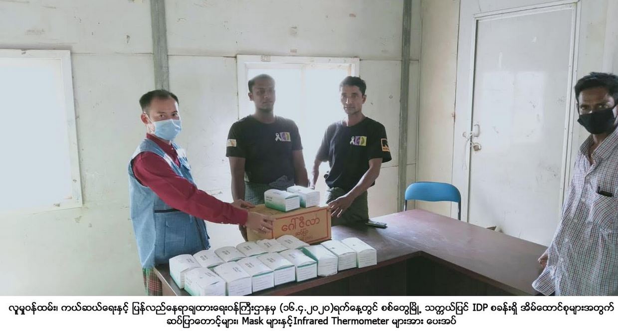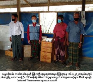 ၁၆-၄-၂၀၂၀ ရက်နေ့တွင် ရခိုင်ပြည်နယ်၊ စစ်တွေမြို့ သက္ကယ်ပြင် IDP စခန်းရှိ အိမ်ထောင်စု (၁၀၀၀) စုနှင့် ဆေးသမားကြီး IDP စခန်းရှိ အိမ်ထောင်စု (၁၈၂၃) စုတို့အတွက် ဆပ်ပြာတောင့် ၂၈၂၃ တောင့်၊ Mask (၅၆၄၆)ခုနှင့် စခန်း (၁)ခုလျှင်Infrared Thermometer (၁) ခုနှုန်းဖြင့် စုစုပေါင်း (၂) ခုကိုထောက်ပံ့ ဆောင်ရွက်ခဲ့ပါသည်။