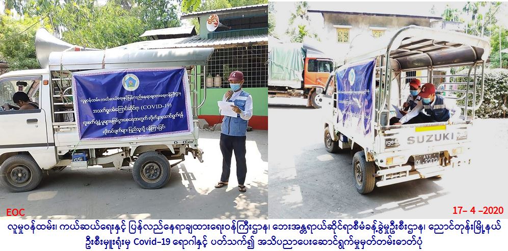 လူမှုဝန်ထမ်း၊ ကယ်ဆယ်ရေးနှင့် ပြန်လည်နေရာချထားရေးဝန်ကြီးဌာန၊ ဘေးအန္တရာယ်ဆိုင်ရာစီမံခန့်ခွဲမှုဦးစီးဌာန၊ ညောင်တုန်း မြို့နယ်ဦးစီးမှူးရုံးမှ တာဝန်ရှိသူများသည် (၁၈.၄.၂၀၂၀) ရက်နေ့တွင် ညောင်တုန်းမြို့နယ်၊ တူးချောင်းကျေးရွာအုပ်စုအတွင်းရှိ ကျေးရွာ၅ရွာ၌ Covid-19 ကာကွယ်၊ တားဆီး၊ ထိန်းချုပ်၊ ကုသရေးဆိုင်ရာ ပြည်သူအသိပညာပေး အသံဖိုင်အား ဖွင့်လှစ်၍ အသိပညာပေးခြင်း၊ လှည့်လည်ဟောပြောခြင်းများ ဆောင်ရွက်ခဲ့ပါကြောင်း သတင်းရရှိပါသည်။