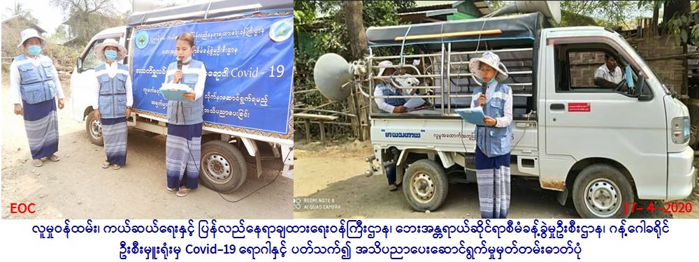 လူမှုဝန်ထမ်း၊ ကယ်ဆယ်ရေးနှင့် ပြန်လည်နေရာချထားရေးဝန်ကြီးဌာန၊ ဘေးအန္တရာယ်ဆိုင်ရာစီမံခန့်ခွဲမှုဦးစီးဌာန၊ ဂန့်ဂေါ ခရိုင်ဦးစီးမှူးရုံးမှ တာဝန်ရှိသူများသည် မာဃသဟာယလူမှုအထောက်အကူပြု အဖွဲ့တို့ဖြင့်ပူးပေါင်းပြီး ဂန့်ဂေါခရိုင်၊ ဂန့်ဂေါ မြို့နယ်၊ မြောက်ခင်ရန်းကျေးရွာ၊ ရွှေမြစ်သာကျေးရွာနှင့် တောင်ခင်ရန်းကျေးရွာများသို့(၁၇-၄-၂၀၂၀)ရက်နေ့ (၀၈:၃၀) နာရီမှ (၁၄:၃၀)နာရီအချိန်ထိ COVID-19 ရောဂါနှင့် ပတ်သက်၍ ကာကွယ်၊ တားဆီး၊ ထိန်းချုပ်၊ ကုသရေးဆိုင်ရာ ပြည်သူလူထု အသိပညာပေးပန်ကြားချက်များကို လှည့်လည်ဟောပြော ဆောင်ရွက်ခဲ့ပါကြောင်း သတင်းရရှိပါသည်။