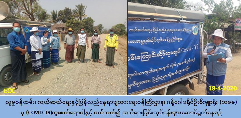 လူမှုဝန်ထမ်း၊ ကယ်ဆယ်ရေးနှင့် ပြန်လည်နေရာချထားရေးဝန်ကြီးဌာန၊ ဘေးအန္တရာယ် ဆိုင်ရာစီမံခန့်ခွဲမှုဦးစီးဌာန၊ ဂန့်ဂေါခရိုင်ဦးစီးမှူးရုံးမှ တာဝန်ရှိသူများသည် မာဃသဟာယ လူမှုအထောက်အကူပြု အဖွဲ့တို့ဖြင့် ပူးပေါင်းပြီး ဂန့်ဂေါခရိုင်၊ ဂန့်ဂေါမြို့နယ်၊ ရွှေဘိုကျေးရွာ၊ သင်တောကျေးရွာနှင် တောင်ခင်ရန်းကျေးရွာများသို့(၁၈-၄-၂၀၂၀) ရက်နေ့(၀၈:၃၀) နာရီမှ (၁၄:၃၀) နာရီအချိန်ထိ COVID-19 ရောဂါနှင့် ပတ်သက်၍ ကာကွယ်၊ တားဆီး၊ ထိန်းချုပ်၊ ကုသရေးဆိုင်ရာပြည်သူလူထု အသိပညာပေးပန်ကြားချက်များကို လှည့်လည်ဟောပြော ဆောင်ရွက်ခဲ့ပါကြောင်းသတင်းရရှိပါသည်။