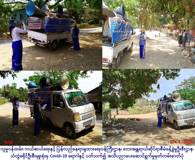 လူမှုဝန်ထမ်း၊ ကယ်ဆယ်ရေးနှင့် ပြန်လည်နေရာချထားရေးဝန်ကြီးဌာန၊ ဘေးအန္တရာယ်ဆိုင်ရာစီမံခန့်ခွဲမှုဦးစီးဌာန၊ သံတွဲခရိုင် ဦးစီးမှူးရုံးမှ တာဝန်ရှိသူများသည် ခရိုင် / မြို့နယ်အထွေထွေအုပ်ချုပ်ရေးဦးစီးဌာန၊ သံတွဲမြို့နယ် သိမ်ကုန်းကျောင်း နာယက ဆရာတော်၊ BHN Association INGO(ဂျပန်)တို့နှင့် ပူးပေါင်း၍ (၁၇- ၄- ၂၀၂၀)ရက်နေ့တို့တွင် နံနက် (၁၀:၄၅)နာရီအချိန်မှ (၁၁:၄၅)နာရီအချိန်ထိ သံတွဲခရိုင်၊သံတွဲမြိ ု့နယ် သစ်ငုတ်တိုကျေးရွာတွင်လည်းကောင်း၊ နေ့လည်(၁၂:၀၀)နာရီမှ(၁၂:၃၀)နာရီထိ သံတွဲခရိုင်၊ သံတွဲမြို့နယ် ညောင်ပင်ကွင်းကျေးရွာတွင် လည်းကောင်းလှည့်လည်ပြီး ကိုရိုနာဗိုင်းရပ်စ်ရောဂါ/ Covid-19 ကာကွယ်၊ တားဆီး၊ ထိန်းချုပ်၊ ကုသရေးဆိုင်ရာပန်ကြား ချက်များအားပြည်သူလူထုသို့ အသိပညာပေးလှည့်လည် ဟောပြော ခြင်းနှင့်လက်ကမ်းစာစောင်များဝေငှဖြန့်ဝေပေးခြင်းများ ဆောင်ရွက်ခဲ့ပါကြောင်း သတင်းရရှိပါသည်။